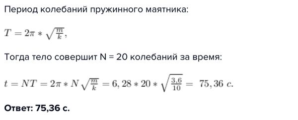 Определите промежуток времени в течение которого тело массой 3,6 кг совершит 20 колебаний на пружине жесткостью 10 Ньютонов деленный на метр
