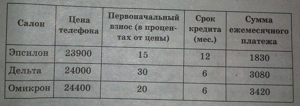 В трех салонах сотовой связи один и тот же телефон продается в кредит на разных условиях. Условия даны в таблице. Определите, в каком из салонов покупка обойдется дороже всего (с учетом переплаты) и в ответ напишите эту наибольшую сумму в рублях.