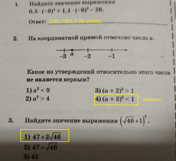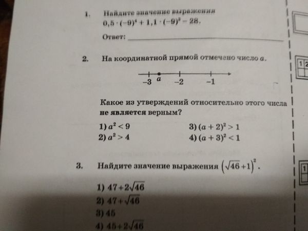 1. Найдите значение выражения 0,5 ⋅ (-9)⁴ + 1,1 ⋅ (-9)³ = 28. 2. На координатной прямой отмечено число a. Какое из утверждений относительно этого числа не является верным? 1) a² < 9 2) a² > 4 3) (a + 2)² > 1 4) (a + 3)² < 1 3. Найдите значение выражения (√46 + 1)².