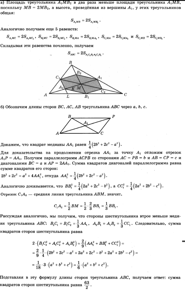 а) Докажите, что площадь шестиугольника A1B2C1A2B1C2 вдвое меньше площади треугольника ABC.