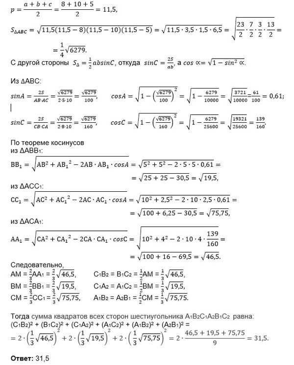 б) Найдите сумму квадратов всех сторон этого шестиугольника, если известно, что AB=5, BC=8 и AC=10