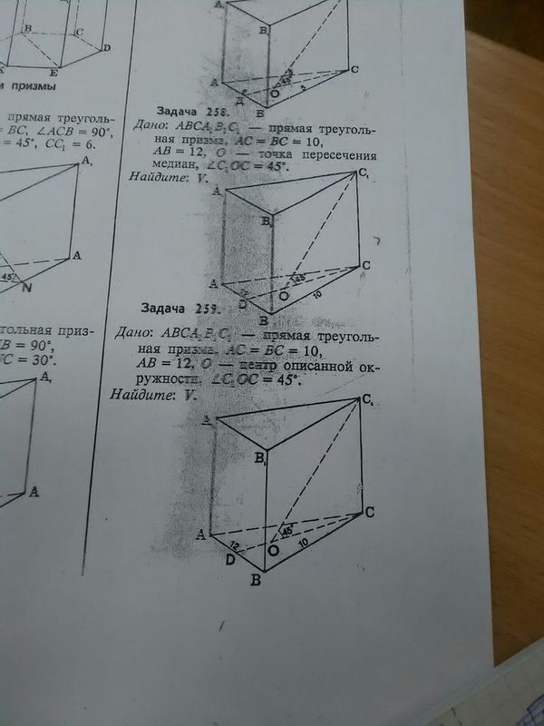 Задача 258. Дано: ABCA_1B_1C_1 - прямая треугольная призма, AC = BC = 10, AB = 12, O - точка пересечения медиан, ∠C_1OC = 45°.