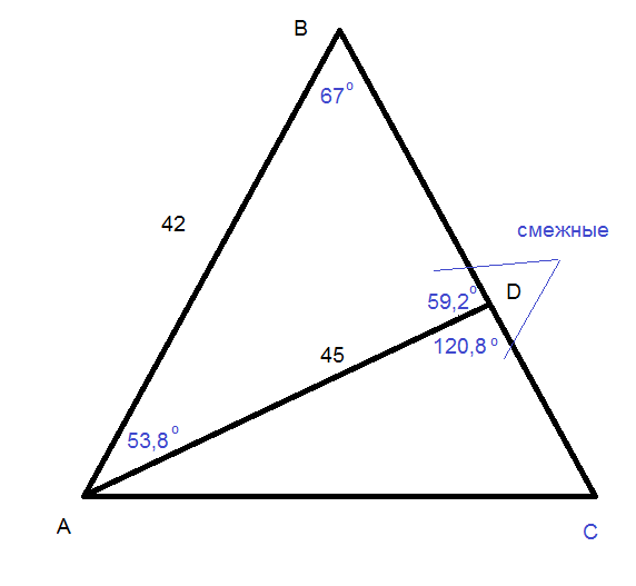 sin ∠ BDA= (42/45)* sin 67 градусов= 0,859