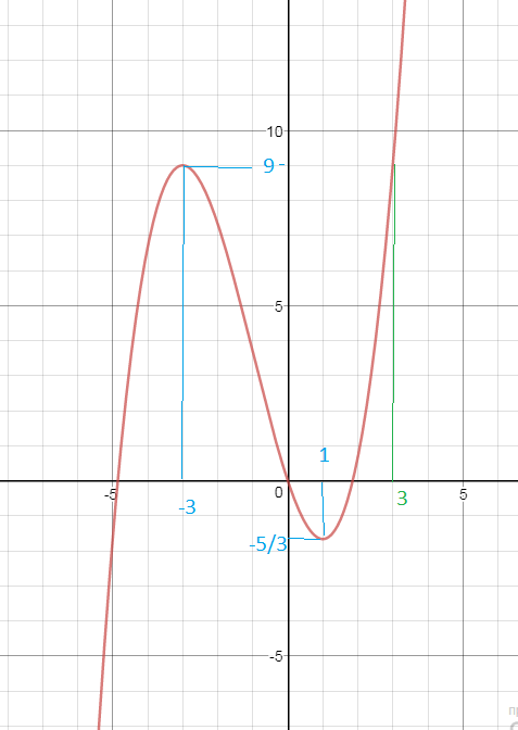 Производная - квадратичная функция, графиком является парабола, веви которой направлены вверх и пересекают ось Ох в точках -3 и 1.