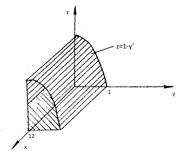 9.3.147) Найти объем тела, ограниченного параболическим цилиндром z=1-у^2, плоскостями у = 0, z = 0, х = 0, х = 12
