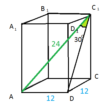 В прямоугольном треугольнике АС1D катет против угла в 30 ° равен половине гипотенузы. AD=12 cм В основании призмы квадрат. АD=DС=12 S(основания)=12^2=144