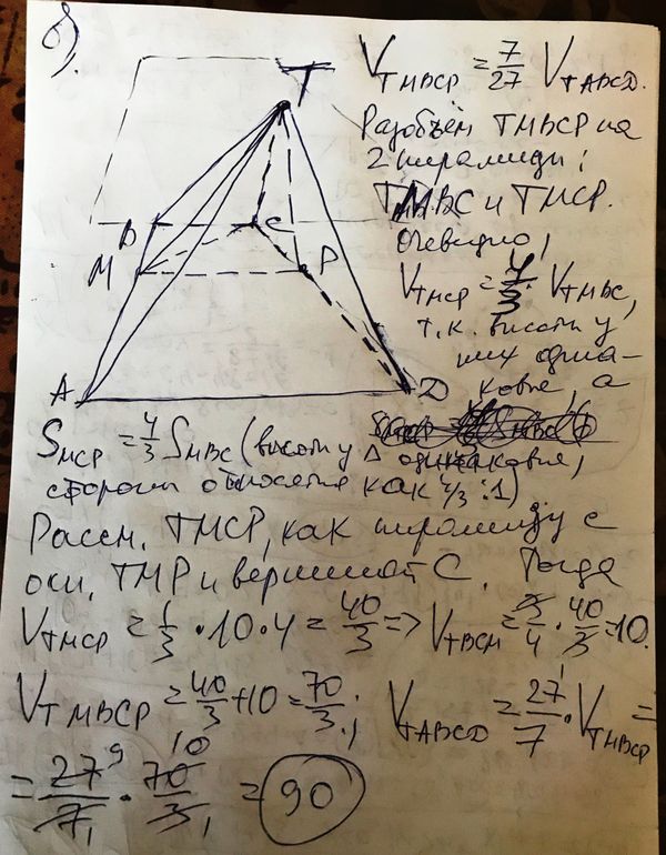 Л 14) В основании пирамиды TABCD лежит трапеция ABCD , в которой ВС||AD и AD:BC=2. Через вершину Т пирамиды проведена плоскость, параллельная прямой ВС и пересекающая отрезок АВ в точке М такой, что АМ:MB=2. Площадь получившегося сечения равна 10, а расстояние от ребра ВС до плоскости сечения равно 4.