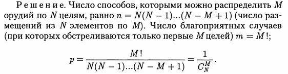 Батарея из М орудий ведет огонь по группе, состоящей из N целей (М меньше или равно N). Орудия выбирают себе цели последовательно, случайным образом, при условии, что никакие два орудия стрелять по одной цели не могут. Найти вероятность р того, что будут обстреляны цели с номерами 1, 2,..., М.