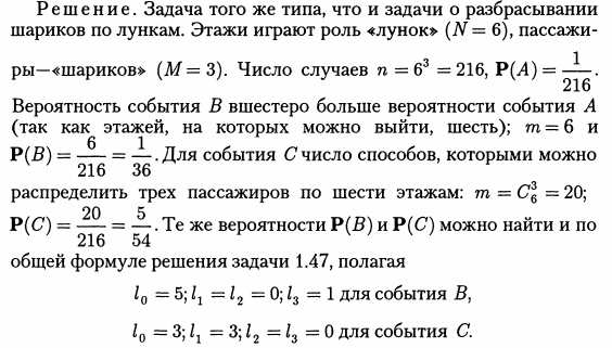 В лифт семиэтажного дома на первом этаже вошли три человека. Каждый из них с одинаковой вероятностью выходит на любом из этажей, начиная со второго. Найти вероятности следующих событий: А — все пассажиры выйдут на четвертом этаже; В — все пассажиры выйдут одновременно (на одном и том же этаже); С— все пассажиры выйдут на разных этажах.