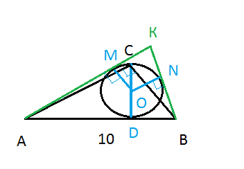 В прямоугольном треугольнике ABC с гипотенузой AB, равной 10, на высоте CD как на диаметре построена окружность. Касательные к этой окружности, проходящие через точки А и В, пересекаются при продолжении в точке К. Чему равны касательные к окружности, выходящие из точки К.