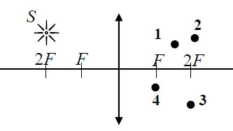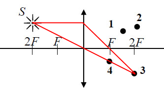 В какой из точек (1, 2, 3 или 4) находится изображение светящейся точки S (см. рисунок), создаваемое тонкой собирающей линзой с фокусным расстоянием F?
