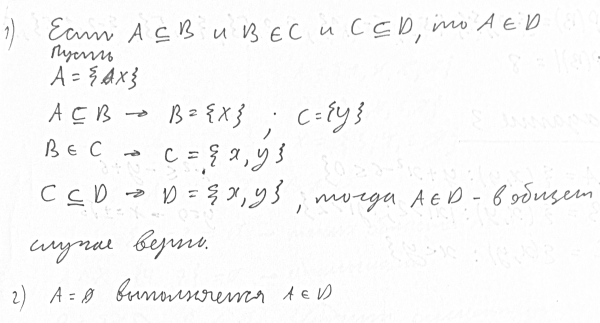 2. Может ли при некоторых А, В, С и D выполниться набор условий: A ⊆ B и B ∈ C и С ⊆ D и A ∈ D ?