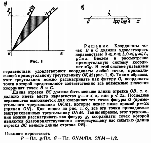 На отрезке ОА длины L числовой оси Ох наудачу поставлены две точки: В(х) и С (у), причем у > =х. (Координата точки С для удобства дальнейшего изложения обозначена через у). Найти вероятность того, что длина отрезка ВС меньше длины отрезка ОВ (рис. 1, а). Предполагается, что вероятность попадания точки на отрезок пропорциональна длине этого отрезка и не зависит отего расположения на числовой оси.