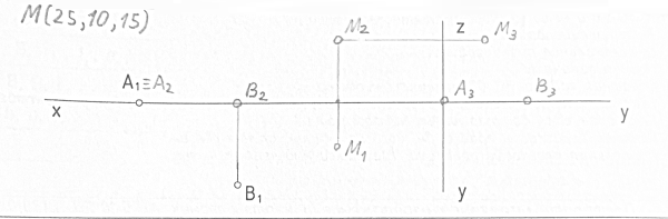 Построить фронтальный и профильные проекции точек А и B, принадлежащих горизонтальной плоскости проекций, и три проекции точки M, удаленной от П1 на 15 мм, от П2 на 10 мм, от П3 на 25 мм.