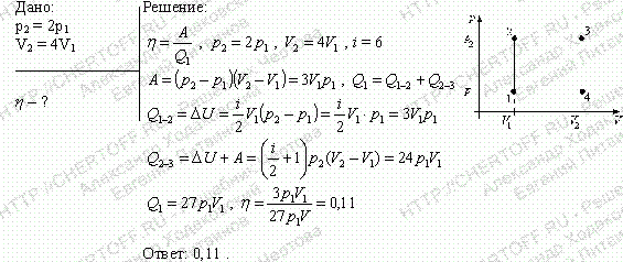 Идеальный многоатомный газ совершает цикл, состоящий из 2 изохор и 2 изобар, причем наибольшее давление газа в два раза больше наименьшего, а наибольший объем в 4 раза больше наименьшего. определить термический КПД цикла.