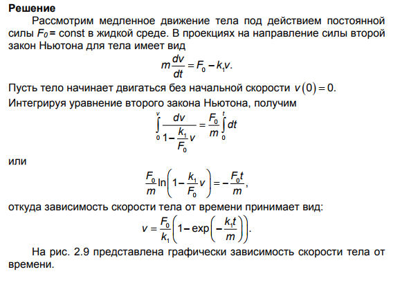 На тело, движущееся в вязкой среде (жидкости) под действием постоянной силы F0 = const, действует сила сопротивления, пропорциональная скорости движения тела F = kv. Определить зависимость скорости движения тела от времени.