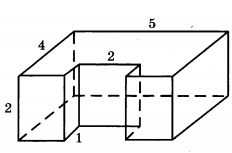 Объем этой детали будет большой параллелепипед со сторонами 2, 4, 5 минус маленький(вырезанный) со сторонами 1, 2, 2