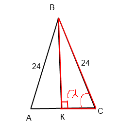 Треугольник равнобедренный, значит медиана падающее на основание равна и биссектрисе и высоте, иными словами перпендикулярна основанию, что дает нам возможность рассмотреть прямоугольный треугольник BKC.