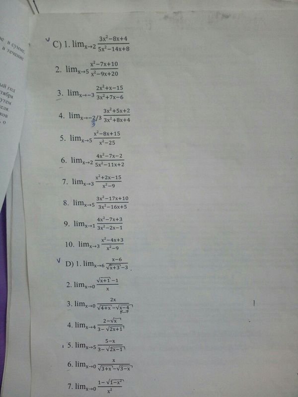 =(0/0)=lim_(x→5)(x-5)(x-2)/(x-5)(x-4)=lim_(x→5)(x-2)/(x-4)= =(5-2)/(5-4)=3 lim_(x→0) (sqrt(x+1)-1)/x=(0/0)= =lim_(x→0)(sqrt(x+1)-1)*(sqrt(x+1)+1)/x*(sqrt(x+1)+1)= =lim_(x→0 x/x*(sqrt(x+1)+1)= =lim_(x→0 1/(sqrt(x+1)+1)=1/2