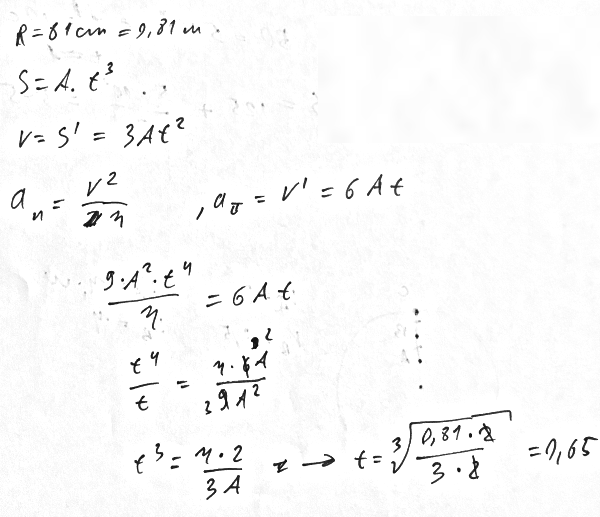 Материальная точка движется по окружности радиусом 81 см согласно уравнению S = At^3, где А = 2 м/с^3. В какой момент времени нормальное ускорение точки будет равно тангенциальному? Ответ дать с точностью до сотых.