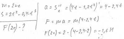 Тело массой 2 кг движется прямолинейно по закону s= 2t^2 – 0,4t^3 . Определить силу, действующую на тело в конце второй секунды движения.