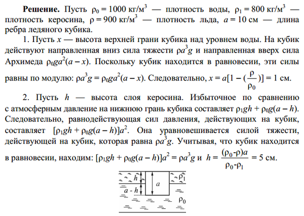 2. Поверх воды доливают слой керосина так, что поверхность керосина оказывается на одном уровне с верхней гранью кубика. Какова высота слоя керосина?