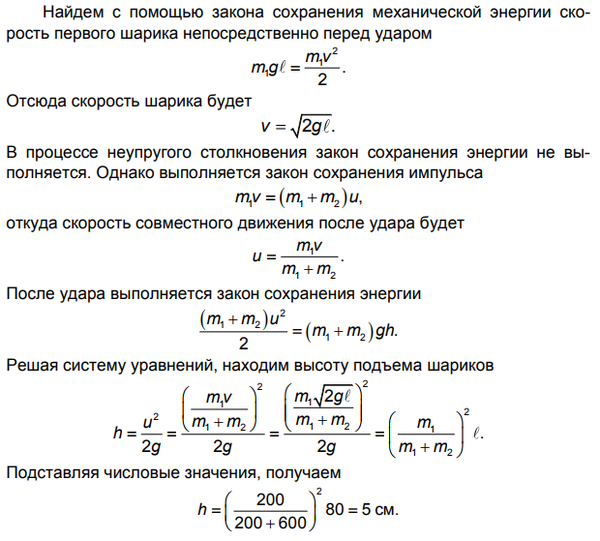 Два шарика, массы которых равны m1 = 200 г и m2 = 600 г, висят, соприкасаясь, на одинаковых нитях длиной l = 80 см. Первый шар отклонили на 90 градусов и отпустили. На какой угол поднимутся шарики удара, если удар считать абсолютно неупругим?