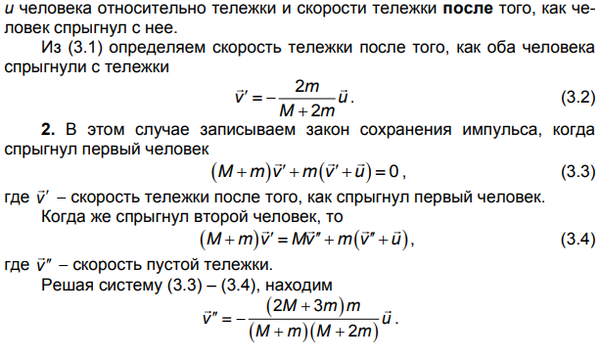 На краю покоящейся тележки массы М стоят два человека, каждый массы m. Пренебрегая трением, найти скорость тележки после того, как оба человека спрыгнут с одной и той же горизонтальной скоростью u относительно тележки: 1) одновременно; 2) друг за другом. В каком случае скорость тележки будет больше и во сколько раз?