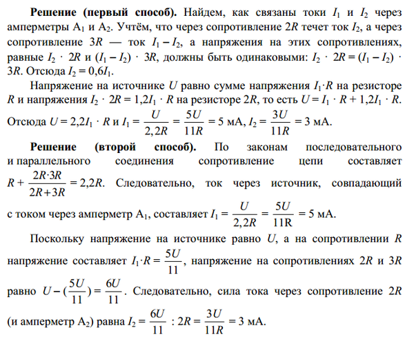 Найдите показания идеальных амперметров А1 и А2 в электрической цепи, схема которой приведена на рисунке. Напряжение идеального источника U = 11 В, сопротивление R = 1 кОм.