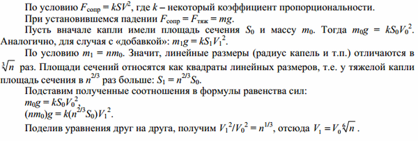 Сферическая капля воды падает в воздухе с установившейся скоростью V0. С какой установившейся скоростью V будет падать капля воды, имеющая в n раз большую массу?Считайте, что сферическая форма капли не меняется при увеличении ее скорости, а сила сопротивления воздуха пропорциональна площади поперечного сечения и квадрату скорости движения капли.