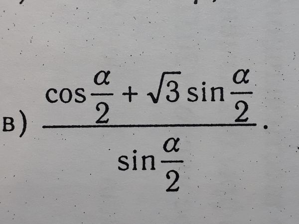 Решение: (cos(a/2)+sgrt(3)sin(a/2))/sin(a/2)= 2(1/2*cos(a/2)+sgrt(3)/2*sin(a/2))/sin(a/2)= =2(sin(p/6)*cos(a/2)+cos(p/6)*sin(a/2))/sin(a/2)= =2/sin(a/2)*sin(p/6+a/2).
