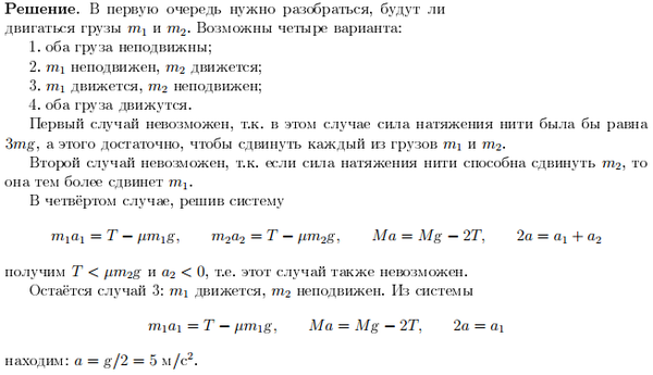 В системе, показанной на рисунке, m1=m, m2=5m, M=6m. Найдите ускорение груза M, если между остальными грузами и столом имеется трение с коэффициентом =05. Принять g=10 м/с^2, массой блоков и трением в их осях пренебречь. Ответ выразить в м/с^2.