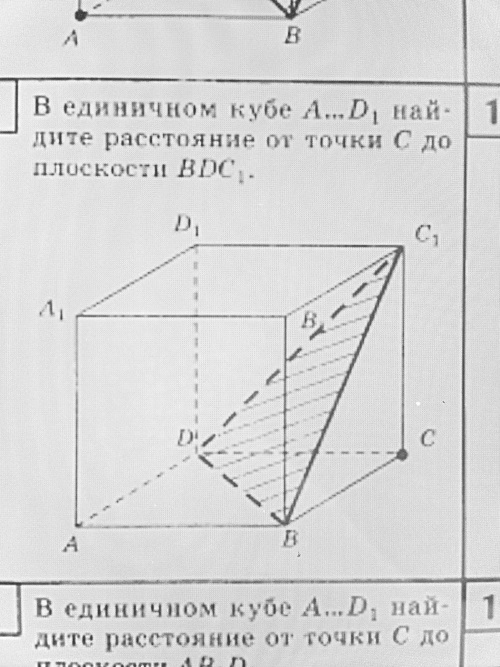 А эта высота и есть искомое расстояние от точки С до BDC1. Ответ:1/sqrt(3)= sqrt(3)/3