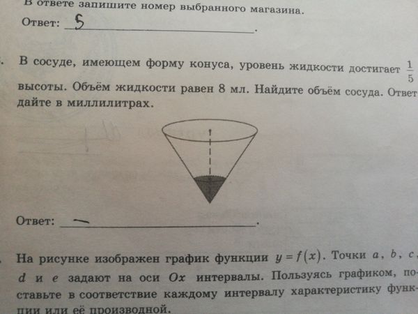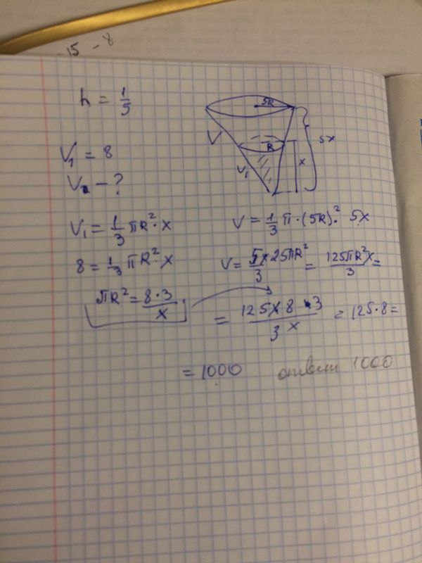 В сосуде, имеющем форму конуса, уровень жидкости достигает 1/5 высоты. Объём жидкости равен 8 мл. Найдите объём сосуда. Ответ дайте в миллилитрах.