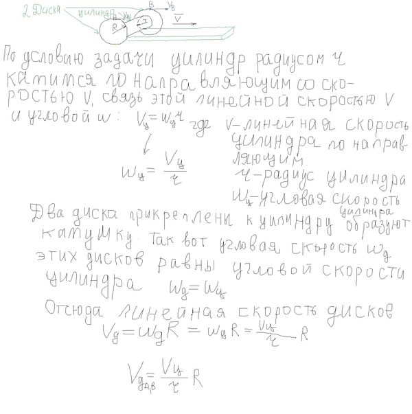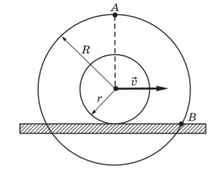 Катушка, состоящая из цилиндра радиусом r и двух дисков радиусами R, катится своей цилиндрической частью по горизонтальным направляющим без проскальзывания со скоростью v. Определить скорости точек А и В диска.