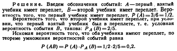 В читальном зале имеется шесть учебников по теории вероятностей, из которых три в переплете. Библиотекарь наудачу взял два учебника. Найти вероятность того, что оба учебника окажутся в переплете.