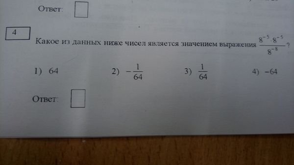 Решение: 8^(-5)*8^(-5)/8^(-8)=8^(-10)/8^(-8)=8^(-2)=1/64 Ответ: 3