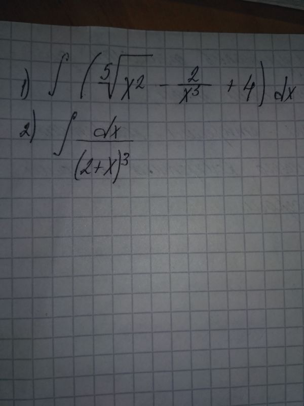 1) = ∫ (x^(2/5)-2x^(-3)+4)dx=x^((2/5)+1)/((2/5)+1) -2x^(-3+1)/(-3+1) +4x+C= =(5/7)*x^(7/5)+(1/x^2)+4x+C 2) = ∫ d(2+x)/(2+x)^3= ∫ (2+x)^(-3)d(2+x)=(2+x)^(-3+1)/(-3+1) + C= =-1/(2(2+x)^2) + C