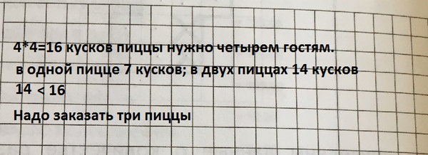 Петя хочет на свой день рождения угостить гостей пиццей, причём так, чтобы каждому из четверых, включая Петю, досталось хотя бы по 4 куска. Каждая пицца разрезана на 7 кусков. Сколько пицц должен заказать Петя?