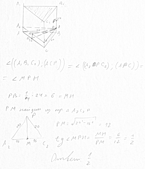 Основанием прямой треугольной призмы АВСА1В1С1является равнобедренный треугольник ABC,в котором АВ = ВС = 20, АС = 32. Боковое ребро призмы равно 24. Точка Р принадлежит ребру ВВ1 причем BP : РВ1 = 1:3. Найдите тангенс угла между плоскостями A1B1C1и АС Р.