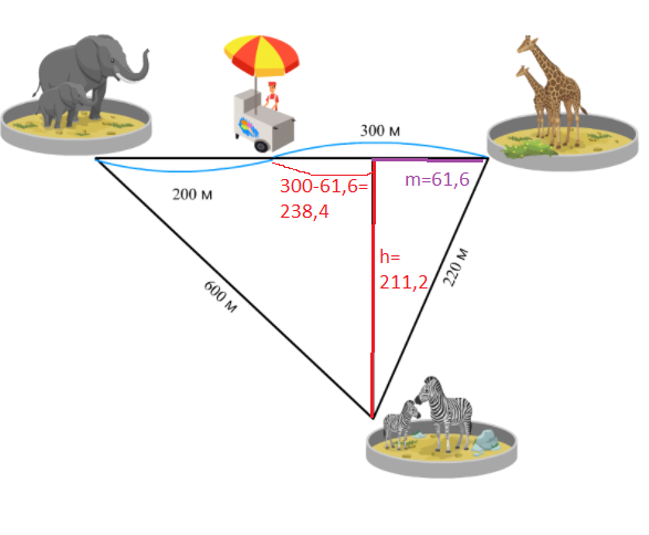 211,2+238,4=449,6 м от вольера с зебрами до продавца мороженого