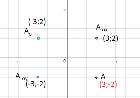 точка, симметричная точке А относительно оси Оx имеет координаты А_(ох)(3;2) точка, симметричная точке А относительно оси Оу имеет координаты А_(оу)(-3;-2) точка, симметричная точке А относительно начала координат имеет координаты А_(о)(-3;2)