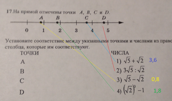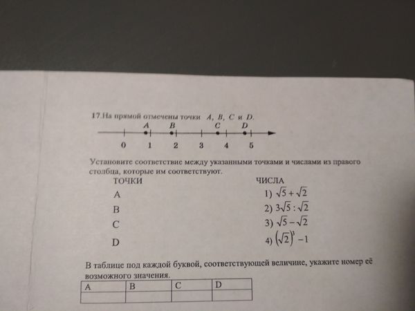 17. На прямой отмечены точки A, B, C и D. Установите соответствие между указанными точками и числами из правого столбца, которые им соответствуют.