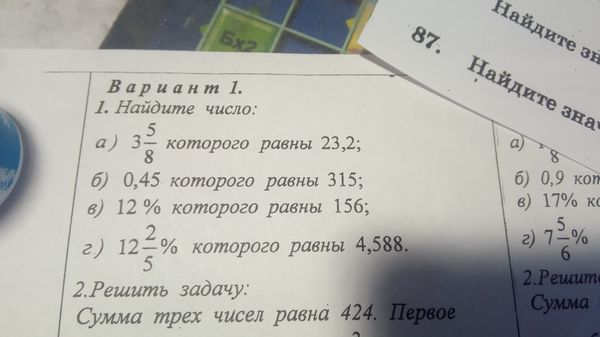 Вариант 1. 1. Найдите число: a) 3 \frac{5}{8} которого равны 23,2; б) 0,45 которого равны 315; в) 12% которого равны 156; г) 12\frac{2}{5} % которого равны 4,588.
