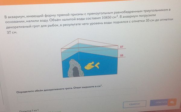 В аквариум, имеющий форму прямой призмы с прямоугольным равнобедренным треугольником в основании, налили воду. Объём налитой воды составил 10850 см³. В аквариум погрузили декоративный грот для рыбок, в результате чего уровень воды поднялся с отметки 35 см до отметки 37 см.
