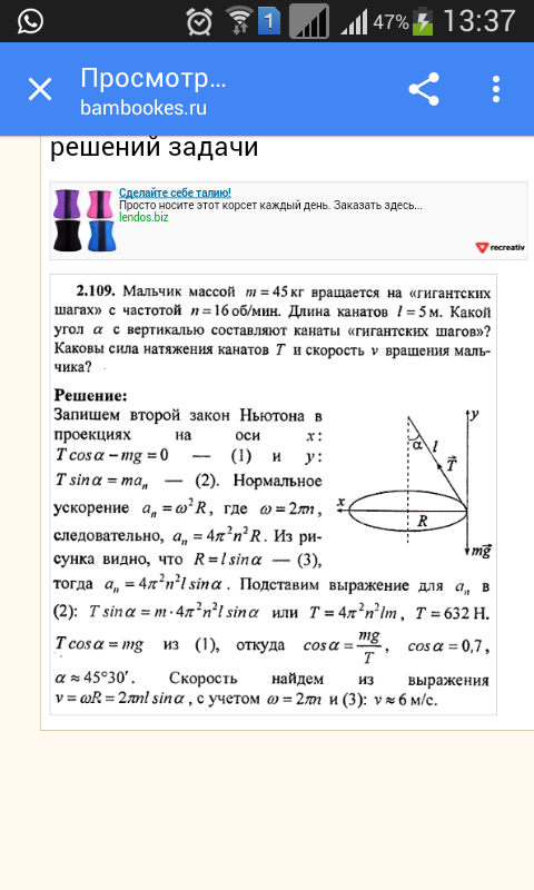 Мальчик массы га=45 кг вращается на «гигантских шагах»'с частотой /г=12 об/мин. Длина каната 1=5 м. Какова сила натяжения Т каната?