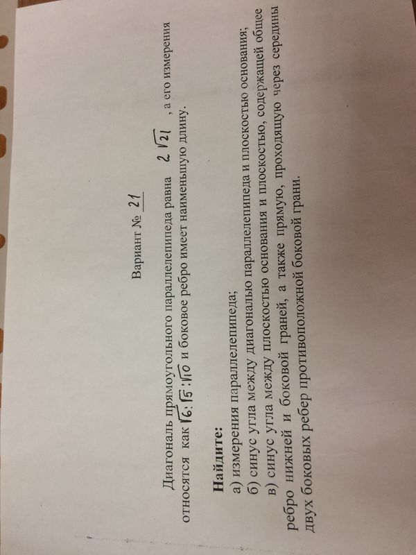 б) синус угла между диагональю параллелепипеда и плоскостью основания;