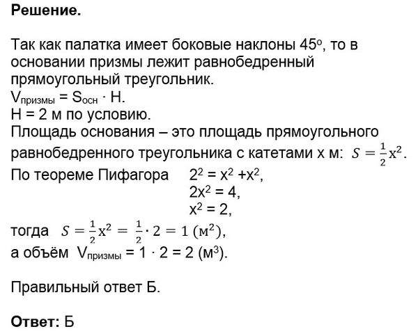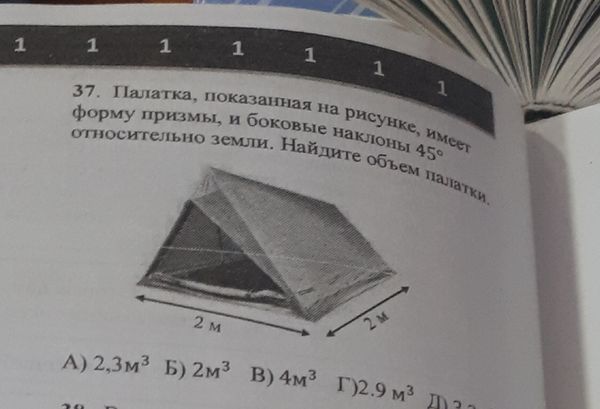 37. Палатка, показанная на рисунке, имеет форму призмы, и боковые наклоны 45° относительно земли. Найдите объем палатки. A) 2,3 м³ Б) 2 м³ В) 4 м³ Г) 2.9 м³