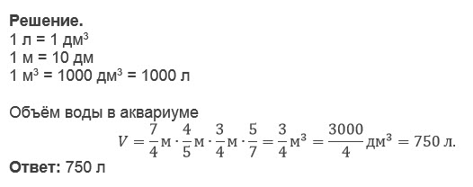 Аквариум в форме прямоугольного параллелепипеда на 5/7 части от высоты наполнен водой. Длина аквариума 7/4м,ширина 4/5м,высота 3/4м. Скажите.литров воды в аквариуме?