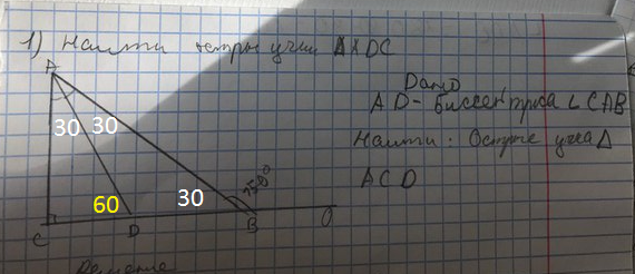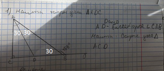 Значит ∠ ВАС = 60 градусов. Биссектриса AD делит этот угол пополам. Значит ∠СAD = ∠DAB = 30 градусов